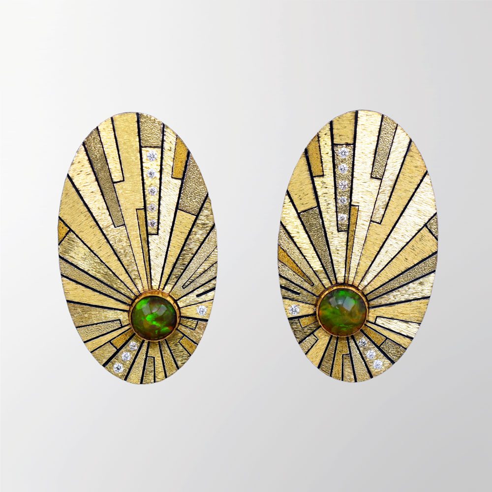 E880 Earrings with 14k gold post in French Clips Opal in the Sky – Expanding Universe: 18k gold sheet fused to sterling silver. 6mm Ethiopian Opal set in 22k gold bezel. Design is carved, engraved, and textured. 2 x 9 diamonds from 1.3mm to 1.0mm. 1.39” h x 0.8” w x 0.17” d; 35.3 x 20.3×4.5mm