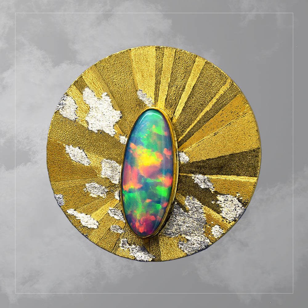 PB191 Brooch/ Pendant combination Opal in the Sky – Rainbow in the Clouds: 22k gold sheet and 14k white gold fused to sterling silver. 13.09 ct Ethiopian Opal set in 22k gold bezel. Design is carved, engraved, and textured. Measures 1.88” / 47.9mm in diameter and 0.37” / 9.4mm deep.